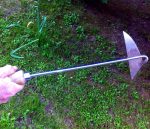 Eins meiner Lieblingswerkzeuge ist der sogenannte Kraftjäter, den es wahlweise für Rechts- und Linkshänder gibt ( meiner ist links). Mit ihm kann ich das Unkraut, je nach Art und Entwicklungsstadium, wahlweise durchtrennen, abstechen oder herauslöffeln. Bei Pfahlwurzeln wie Löwenzahn führe ich die Klinge senkrecht, bei Flachwurzlern eher waagercht knapp unter der Erdoberfläche. So erwische ich mehrere ,,Spontanvegetationen“ auf einmal, und der Boden ist gleichzeitig gelockert. Besonders in Staudenbeeten ist er hervorragend einsetzbar, da er wenig Platz benötigt und andere Pflanzen nicht beschädigt.