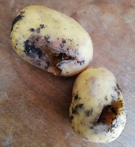Bei der ganzen Aktion habe ich nicht einen Regenwurm gesehen. Selbst als ich mit dem Spaten einmal probehalber eine Scholle umgelegt habe—nichts. Dafür haben wohl einige andere Bodenbewohner meine Kartoffel als Feuchtigkeitsdepot entdeckt. Gut ein Drittel der Kartoffeln hat Fraßschäden und Bewohner. Ja, bei der Trockenheit hilft sich jeder, so gut wie er kann.