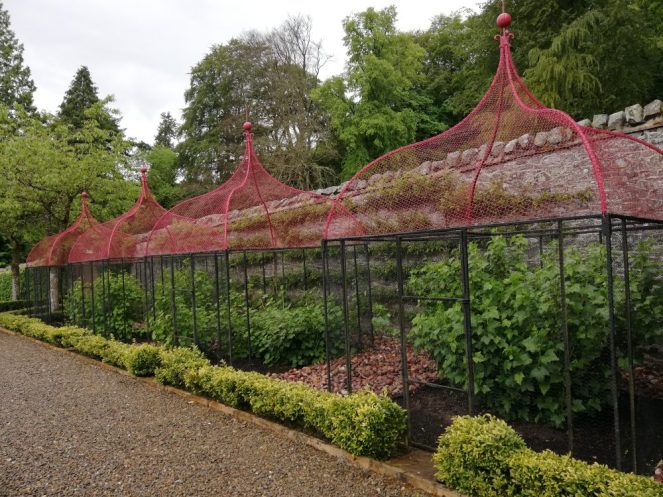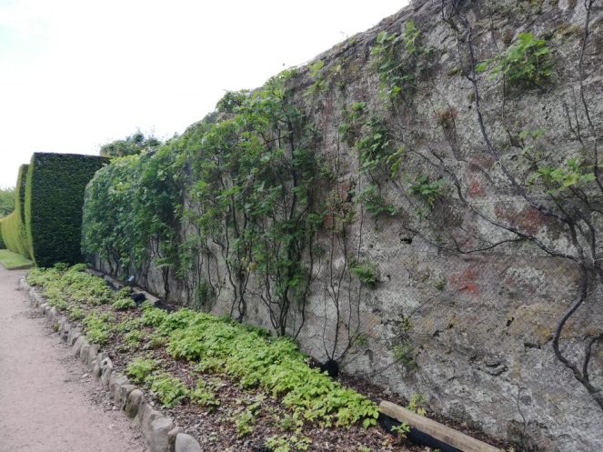 Bei den Gartenbesichtigungen während unserer Gartenrundreise waren auch immer sehr schöne viktorianische Küchengärten auf dem Besuchsplan. Ich staune immer wieder, wie die Gärtner dieser Epoche selbst im hohen Norden fähig waren, alle Bewohner eines Herrenhauses ganzjährig mit Obst und Gemüse zu versorgen. Durch den Golfstrom ist es im Westen Schottlands zwar nicht so kalt, aber der Wind und der Regen sind doch für jeden Gärtner eine Herausforderung. Der begegneten sie, indem die Küchengärten mit einer hohen Mauer zum Schutz umgeben sind. An vielen Orten war diese Mauer auch beheizbar, mit der gleichen Technik, mit der die Römer ihre Bäder betrieben. Die Mauern waren hohl und wurden mit einem Holzofen von außen beheizt. Es war die Aufgabe der Lehrbuben den Ofen Tag und Nacht mit Brennmaterial zu versorgen.
