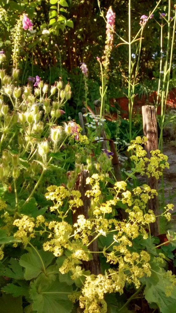 Was das Abschneiden von Verblühtem angeht, so hat das nicht nur optische Gründe, sondern es verhindert auch die kräftezehrende Samenbildung. Öfterblühende Rosen, Taglilien und Skabiosen putze ich regelmäßig aus. Die einmalblühenden Rosen nicht, da hoffe ich auf Hagebutten. Wer einjährige Sommerblüher hat wie Geranien, Verbenen, Petunien, sollte das ebenfalls tun. Stauden wie Storchschnabel, Frauenmantel und Katzenminze schneide ich nach der Blüte ziemlich radikal zurück, den Salbei bis auf ca 15cm. Meistens blühen sie dann ein zweites Mal.