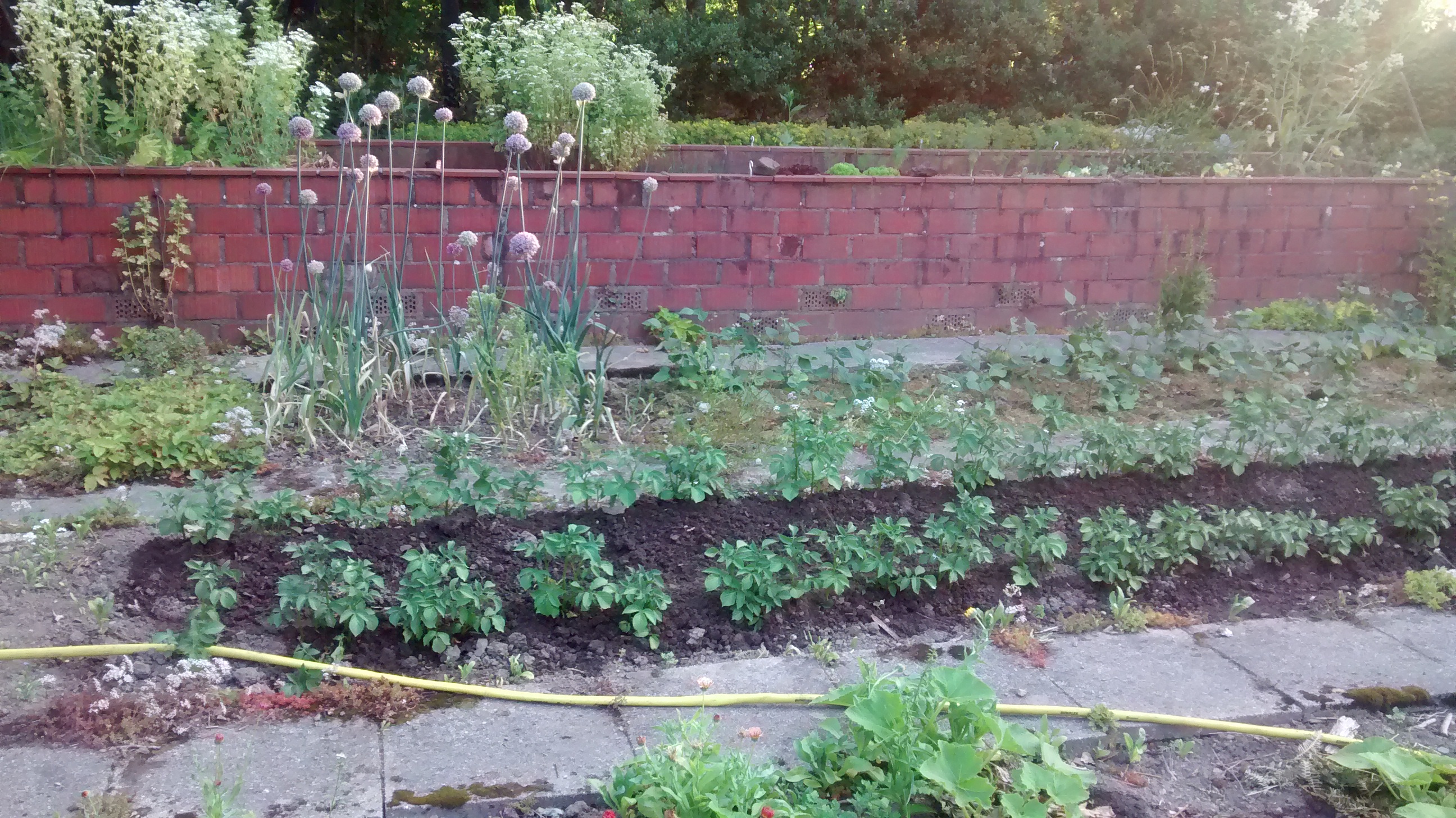 Die Starkzehrer im Gemüsebeet ( alle Kohlsorten, Kartoffeln, Kürbis, Mangold, Porree, Tomaten, Zucchini) freuen sich jetzt über eine Düngergabe, damit sie nicht mickern. Die Erdbeerpflanzen sind abgeerntet und bilden Ranken. Die schneide ich ab ( nicht reißen!), um die Mutterpflanzen nicht noch mehr zu schwächen. Auch hier wäre jetzt eine Düngung angebracht, allerdings muss ich in diesem Jahr neue Pflänzchen auf ein neues Beet setzen, also lasse ich ein paar Ranken dran. Spätestens im August sollte das erledigt werden.
