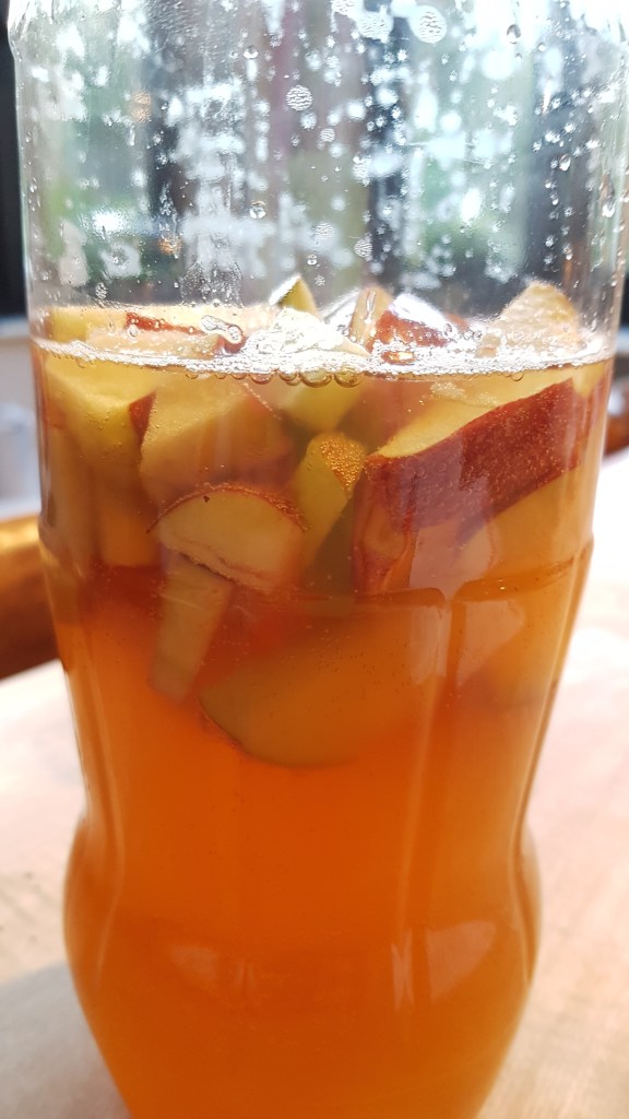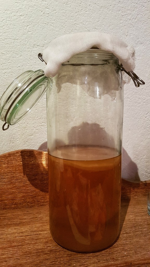 Die Flasche gut verschließen und 1 – 2 Tage bei Zimmertemperatur stehen lassen. An der Form der Flasche kann man erkennen, dass durch die sich bildende Kohlensäure Druck entsteht. Den Kombucha danach in den Kühlschrank stellen (verlangsamt den Gärprozess) und innerhalb von 8 – 10 Tagen aufbrauchen.