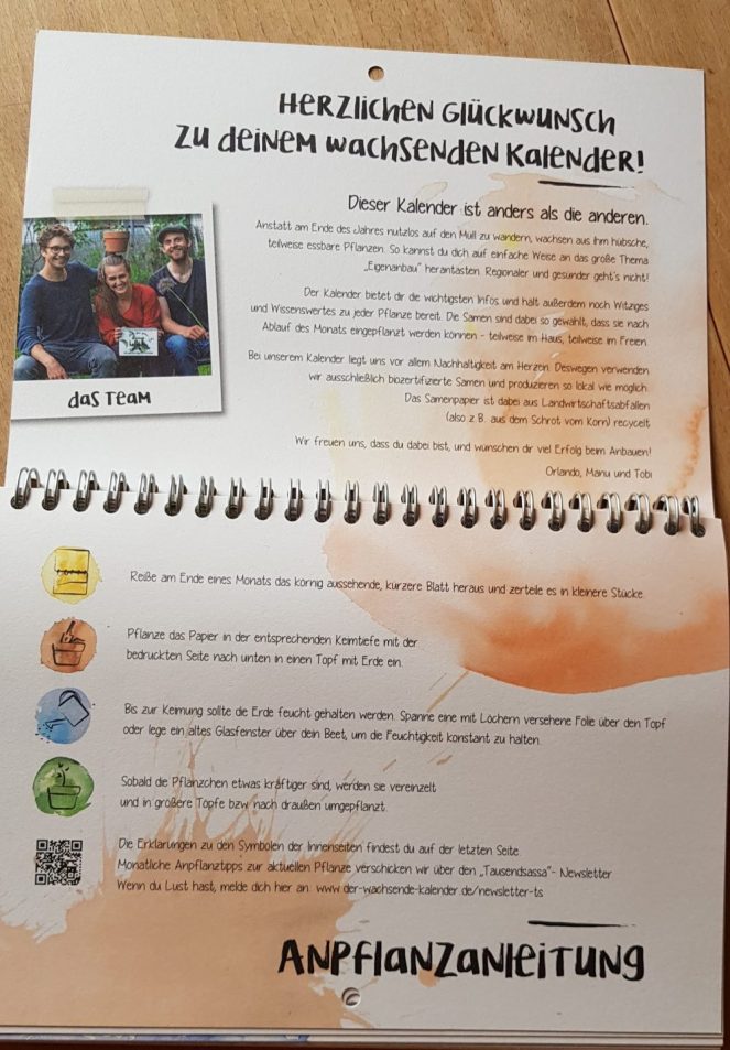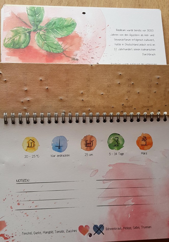 Ich möchte Euch hier einen Kalender vorstellen, der anders ist als andere. Er enthält wunderbar illustrierte Pflanzenportraits, die allerlei Witziges und Wissenswertes rund um die jeweilige Pflanze enthalten. Und dazu dann jeweils ein nachhaltig aus Stroh oder Schrot hergestelltes Samenpapier mit den entsprechenden Pflanzensamen. Auch eine ausführliche Anpflanzanleitung ist dabei. Die Pflanzenportraits mit den Samen sind so ausgewählt, dass sie nach Ablauf des Monats ausgesät werden können, teilweise im Haus und teilweise im Freien. Außerdem gibt es auf den Kalenderblättern dann noch Platz zum Dokumentieren der Arbeitsschritte, wenn man möchte.