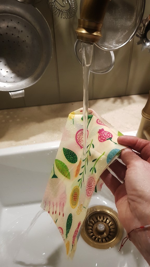 wenn du ein mildes Öko-Spülmittel nimmst und das Tuch nur unter lauwarmem Wasser abspülst, sollte es gehen. Auch beim vorsichtigen Schrubben des Flecks, darauf achten, dass noch ein Rest Wachs an der Stelle verbleibt. Klappt das nicht, weil die Verschmutzung zu stark ist, dann solltest du das Wachstuch tatsächlich gründlich mit heißem Wasser reinigen und wieder auffrischen, also neu machen. Ich putze es nicht jedes Mal mit Spülmittel ab, sondern spüle nur mit Wasser ab. Es kommt natürlich auf das Lebensmittel an, was ich verpackt habe.
