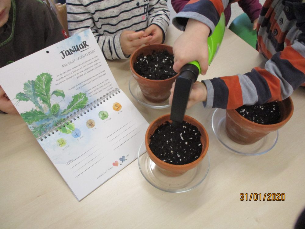 Zu einem dieser Kindergärten ist der Kontakt nicht abgebrochen und ich habe mitverfolgt, wie nachhaltig das Projekt, das es leider nicht mehr gibt, bis heute dort gelebt wird. In diesem Frühjar werden dort mit den Eltern zusammen neue Hochbeete gebaut. Als mir Ende vergangenen Jahres der Wachsende Kalender zur Rezension angeboten wurde, habe ich ihn dem Kindergarten angeboten. Der Wachsende Kalender ist ein nachhaltiger Wandkalender, den man einpflanzen kann. Jeder Monat beschreibt eine andere Blumen- oder Gemüsesorte, deren Samen in das Kalenderblatt eingearbeitet sind. Am Ende eines Monats reißt man das Kalenderblatt heraus und pflanzt es ein. Die Aussaat von verschieden Gemüsen, Kräutern und Salaten ist sehr anschaulich beschrieben und wird zudem noch von einer monatlichen Pflanzenpost begleitet, wenn man möchte. Dieser Newsletter beschreibt genau, wie man bei der Anzucht und Pflege der Pflanzen vorgehen kann und ergänzt die Empfehlungen auch noch mit Rezepten, wenn man dann geerntet hat.