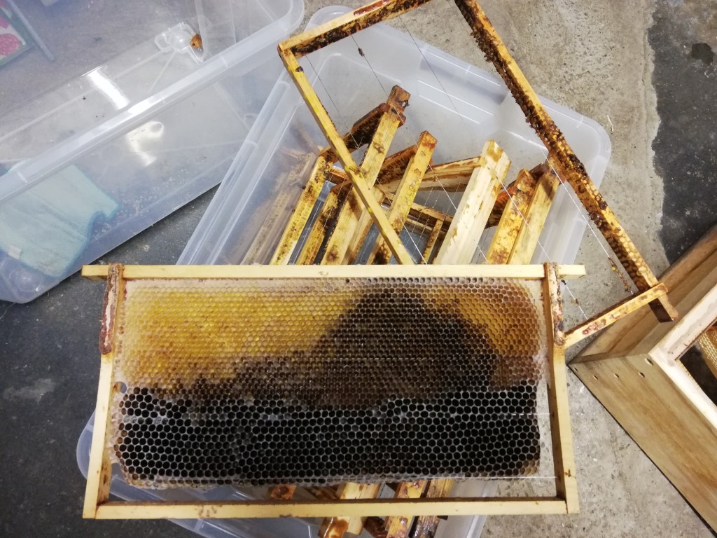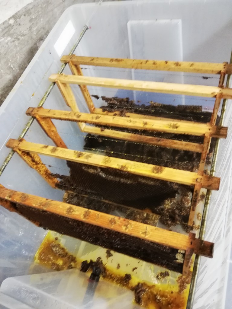 Die Holzrähmchen möchte ich in der nächsten Saison wieder benutzen. Das Wachs sammle ich für neue Mittelwände oder zur Herstellung von Kerzen.