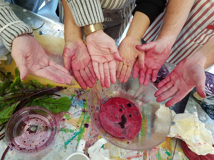 Die aus unseren Pflanzen gewonnenen Grundfarben, bzw. deren PH-Wert, haben wir durch Zugabe von Zitronensaft, Natron, Asche oder Kreide verändert. Immer mit einem „Mäusetränchen“ Wasser. Wir haben probiert und experimentiert. Dabei herausgekommen sind wunderbare Pflanzenfarben.