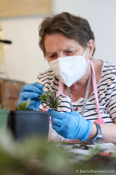 Ab April 2020 haben wir „unseren Garten“ im Vicus-Treff angelegt. Wir haben die Pflanzen gesät und gepflanzt, die wir hübsch fanden und zu denen wir aus dem Wissen und der Erinnerung Zugang hatten. Wichtig war uns außerdem eine Ergänzung unseres Speiseplans, die Möglichkeit einer jahreszeitlichen Dekoration und die sinnliche Anregung über Duft oder Haptik. Auf spezielle Färberpflanzen haben wir verzichtet.