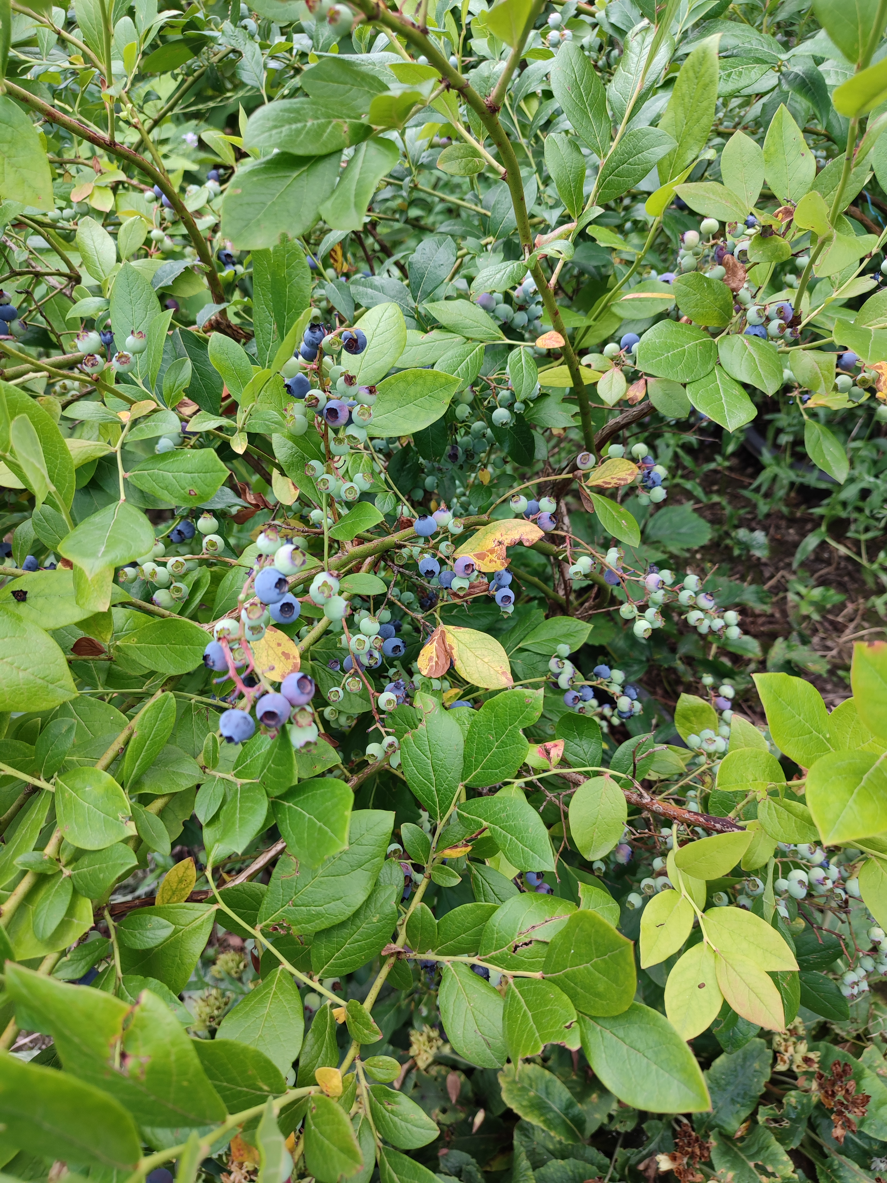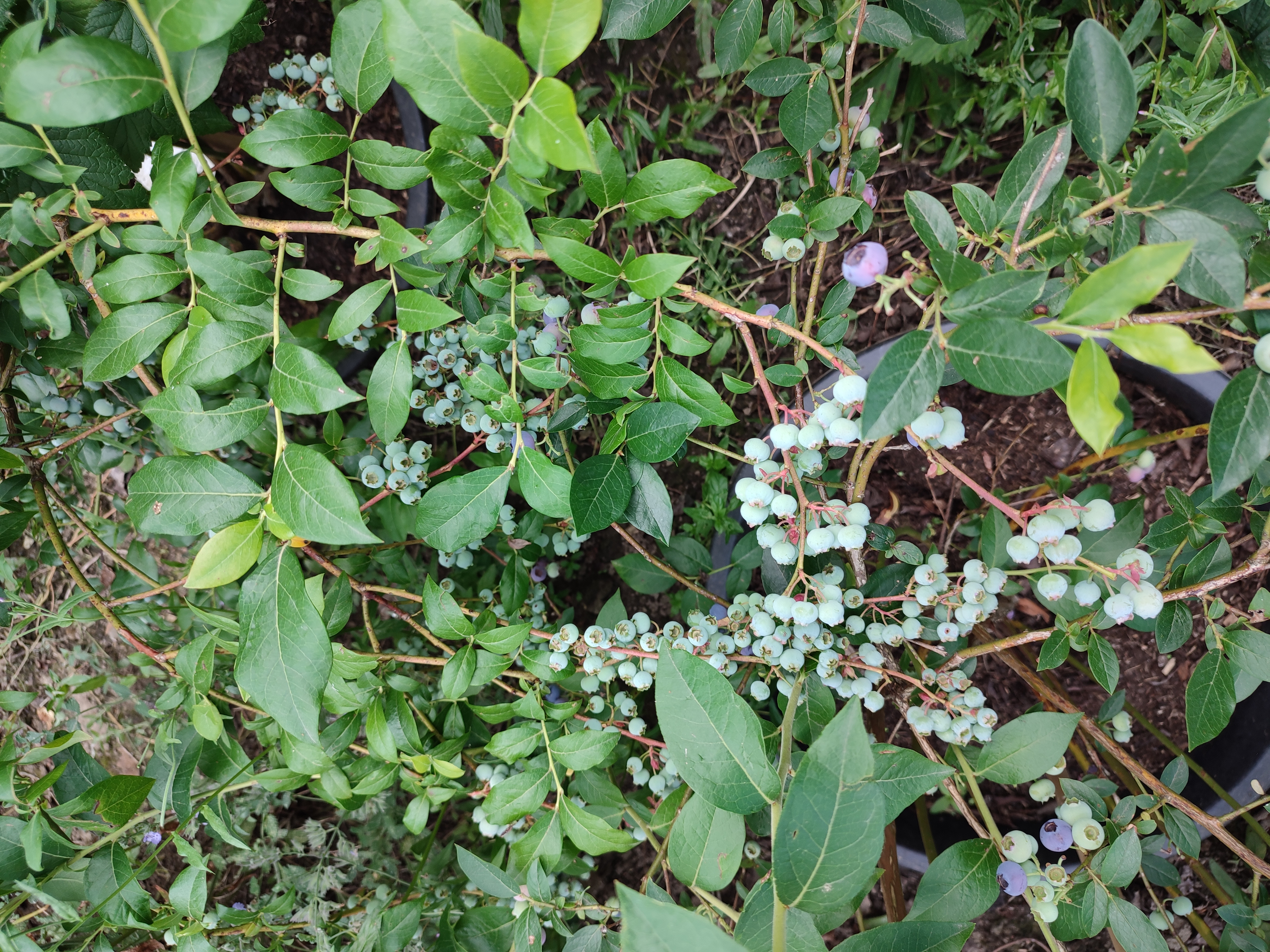 In diesem Jahr ist die Beerenernte besonders gut. Angefangen mit den Erdbeeren, gefolgt von Johannisbeeren, Stachelbeeren und Himbeeren. Zu meiner großen Freude gibt es auch viele Blaubeeren, die erste richtige Ernte, nachdem ich die Sträucher gepflanzt habe. Da Blaubeeren sauren Boden brauchen, habe ich Speisskübel mit Bodenlöchern in der Erde versenkt und mit Rhododendronerde gefüllt. Die Blaubeeren müssen gut und anhaltend gewässert werden, da sie Flachwurzler sind und normalerweise am Waldrand in halbschattiger Lage wachsen. Sonst lassen sie die Blüten fallen oder die angesetzten Früchte. Ich habe verschiedene Blaubeersorten gepflanzt damit die Befruchtung besser klappt.